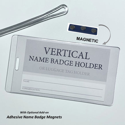 One holder. Multiple uses. Wear your name badge in style with this sleek vertical badge holder. Crafted with clear rigid vinyl material for durability, wear it with your own lanyard and or add an optional magnetic backing for dual usage to wear horizontally. Plus, it comes with a clear loop strap for easy attachment to use as a luggage tag instead! Look great and travel with ease! This badge holder fits your JW convention lapel card nicely!